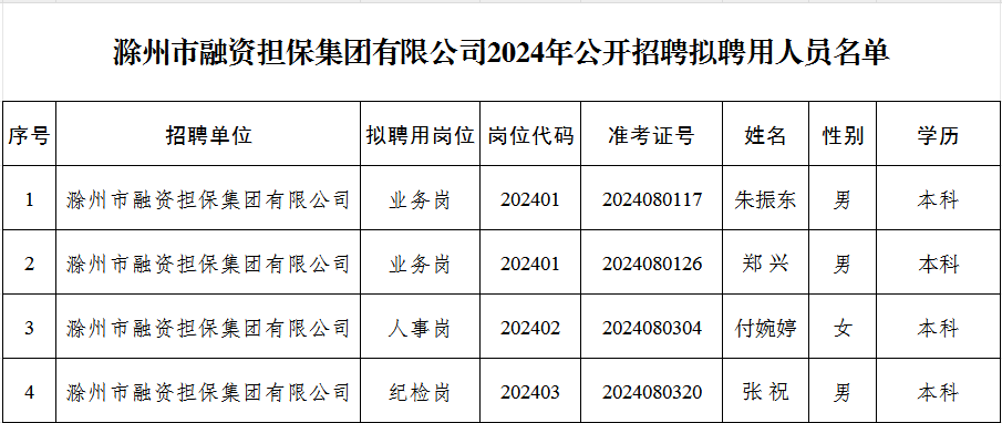 滁州市融資擔(dān)保集團(tuán)有限公司2024年公開(kāi)招聘擬聘用人員公示
