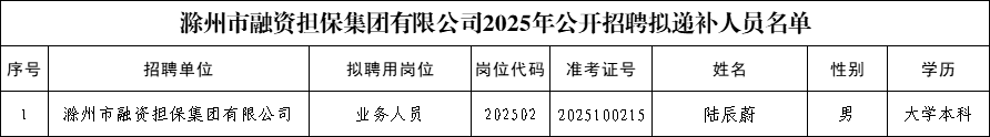 滁州市融資擔(dān)保集團(tuán)有限公司2025年公開招聘擬遞補(bǔ)人員公示